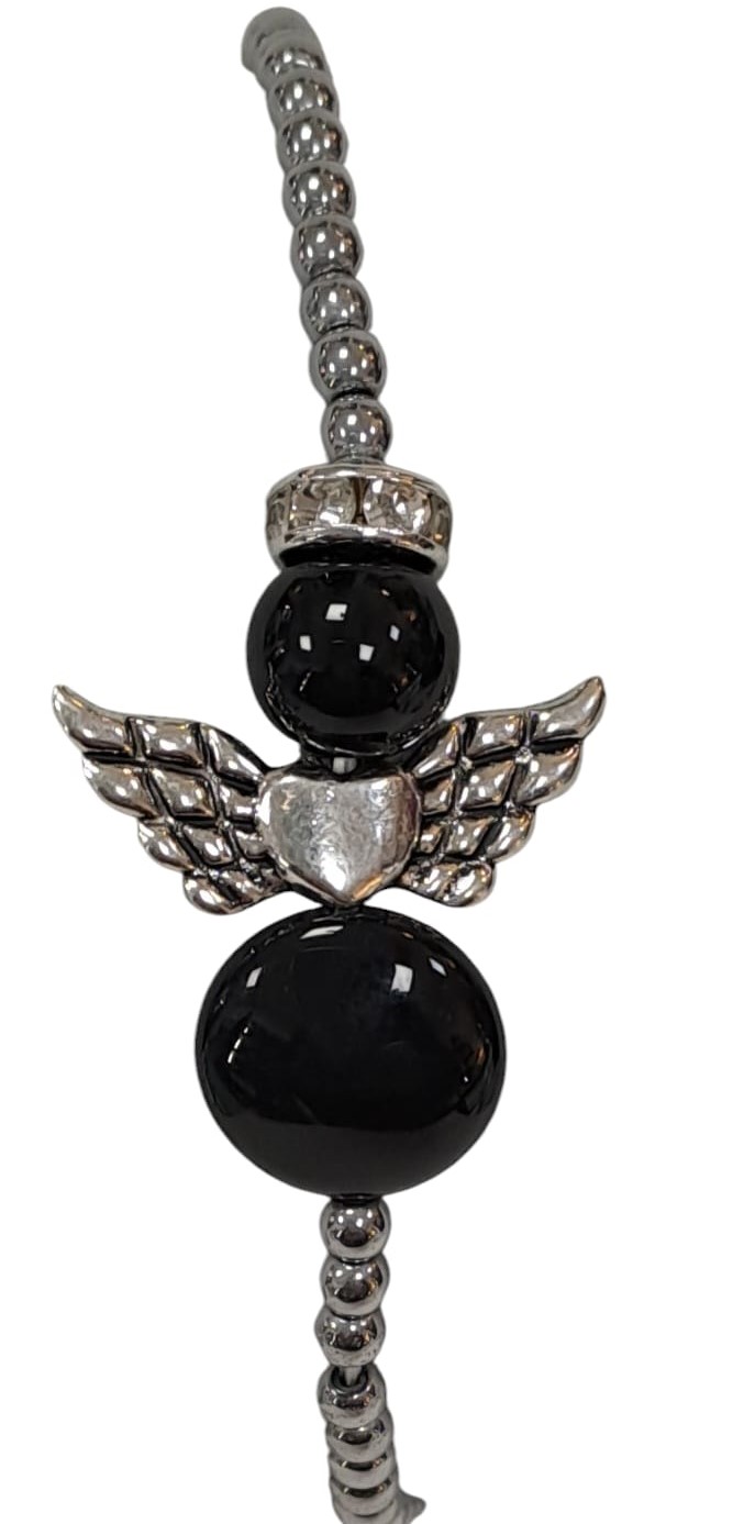 Qui lo troviamo con pietra onice nero con le ali in ottone galvanizzato color argento infilato in un filo elastico con pietrine in ematite