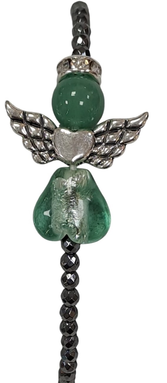 Qui lo troviamo con pietra agata verde con le ali in ottone galvanizzato color argento infilato in un filo elastico con pietrine in ematite