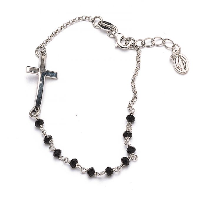 Un bellissimo bracciale rosario in grani neri e una croce in argento leggermente curva per adattarla alla forma del polso.