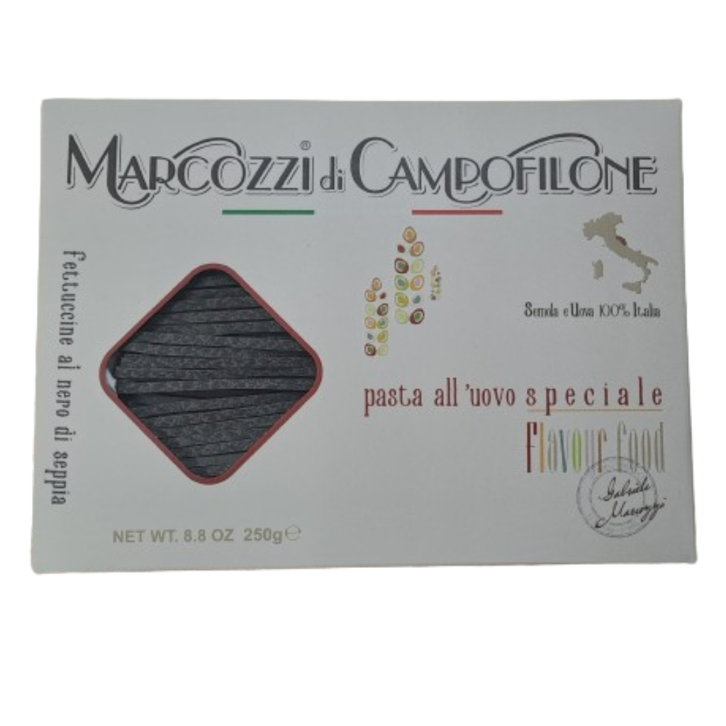 Le fettuccine al nero di seppia dell' Antica Pasta di Campofilone hanno una lavorazione artigianale senza coloranti e conservanti.