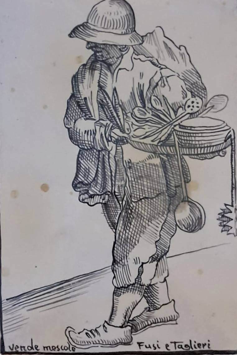 Pensata e realizzata dagli artigiani, nelle fattezze e nel colore come una pergamena antica . raffigurante vari mestieri : qui è rappresentata la figura del vende mescole, Fusi e Taglieri secondo una collezione di stampe di Annibale Caracci del 1500.