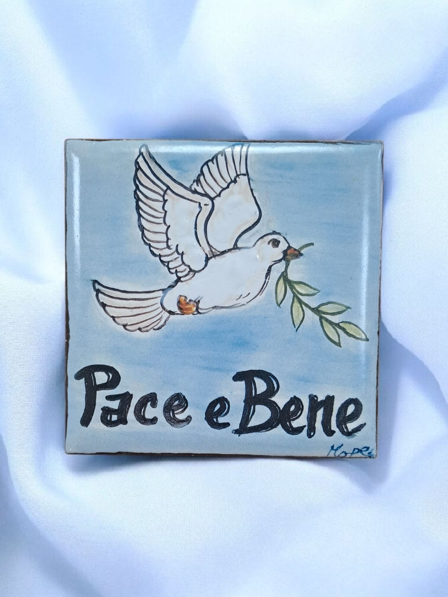 Mattonella che raffigura una Colomba bianca in volo frontale ad ali spiegate con un ramoscello di ulivo, simboli della Pace, con la scritta sotto Pace e Bene il tutto su sfondo azzurro tenue tendente al bianco e contorni irregolari bianchi.