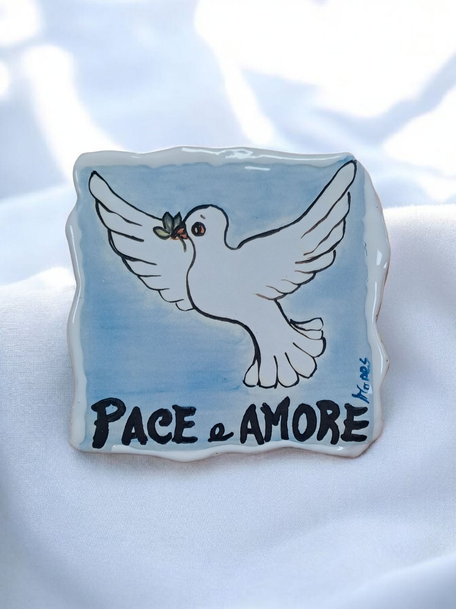 Mattonella che raffigura una Colomba bianca in volo con un ramoscello di ulivo, simboli della Pace, con la scritta sotto Pace e Amore il tutto su sfondo azzurro tenue tendente al bianco e contorni irregolari bianchi.