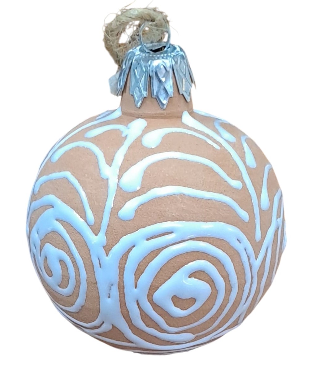Bellissimo addobbo natalizio in terracotta : la terracotta viene lasciata con il suo colore naturale e viene pitturata in rilievo con disegni bianchi.