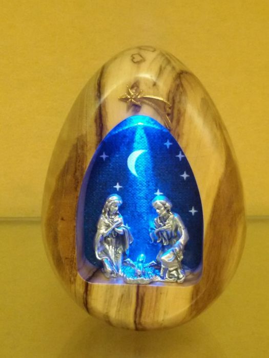 Piccolo presepe ricavato in una cavità dal legno di ulivo con cielo stellato sullo sfondo e la possibilità di illuminarlo con una luce interna incorporata , tasto per accenderlo posto sul retro.