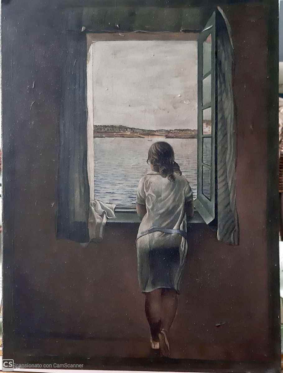L'originale è stato dipinto da Salvador Dalì nel 1925 e raffigura la sorella, Ana Maria, affacciata alla finestra dalla casa di famiglia di Cadaquès : bellissimo il modo in cui il pittore esalta la figura della sorella nella stessa maniera in cui esalta il panorama che sta guardando.