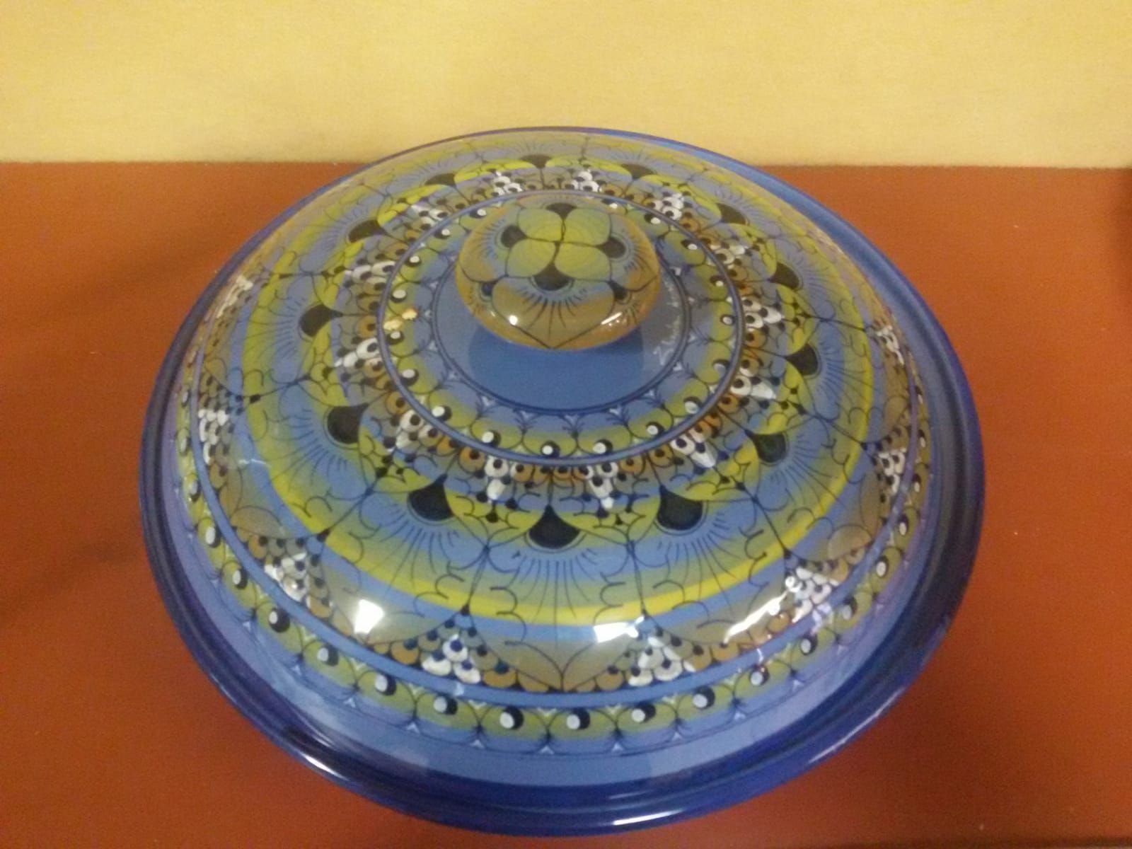 Una bellissima tortiera lavorata artigianalmente su tonalità blu e sfumature di giallo - verde - bianco,